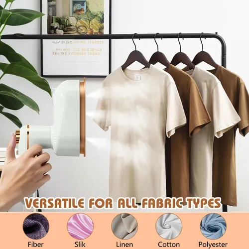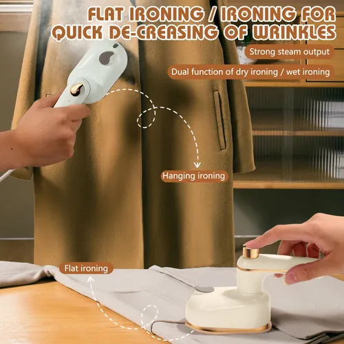 About This ProductSafety First: This portable steam iron features anti-scalding technology for safe wrinkle removal. A built-in intelligent system regulates steam volume and temperature to prevent overheating and dry-out, allowing worry-free garment care. It's especially suitable for delicate fabrics.Easy to Use: Switching between flat ironing and ironing modes simplifies garment care. The ergonomic handle allows for comfortable one-handed operation, while instant steam and convenient controls deliver fast, professional results.Portable: This mini steam iron boasts a compact design and portability, making it ideal for travelers and students. Its compact size makes it easy to store in a suitcase or in a corner of a dorm room while maintaining all its features.More Features: Instantly removes stubborn wrinkles, neutralizes odors, and leaves fabrics clean and shiny. Its versatile design is suitable for clothing, curtains, and upholstery. Compact and efficient, it delivers professional-quality cleaning results anytime, anywhere.Wide Application: Easily combat wrinkles at home or on the go. The foldable and swivel design ensures easy storage even in small spaces or suitcases, making it a versatile companion for business trips, vacations, or everyday wear.